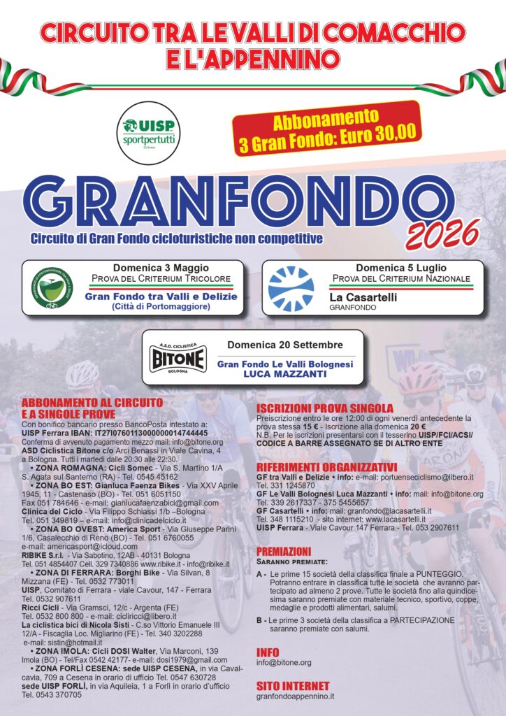 IL CIRCUITO EDIZIONE 2026 SI RINNOVA E SI PROPONE CON TRE PROVE DI GRANFONDO CICLOTURISTICHE A BOLOGNA, FORLI’ E PORTOMAGGIORE…A PRESTO CON TUTTE LE NOVITA…